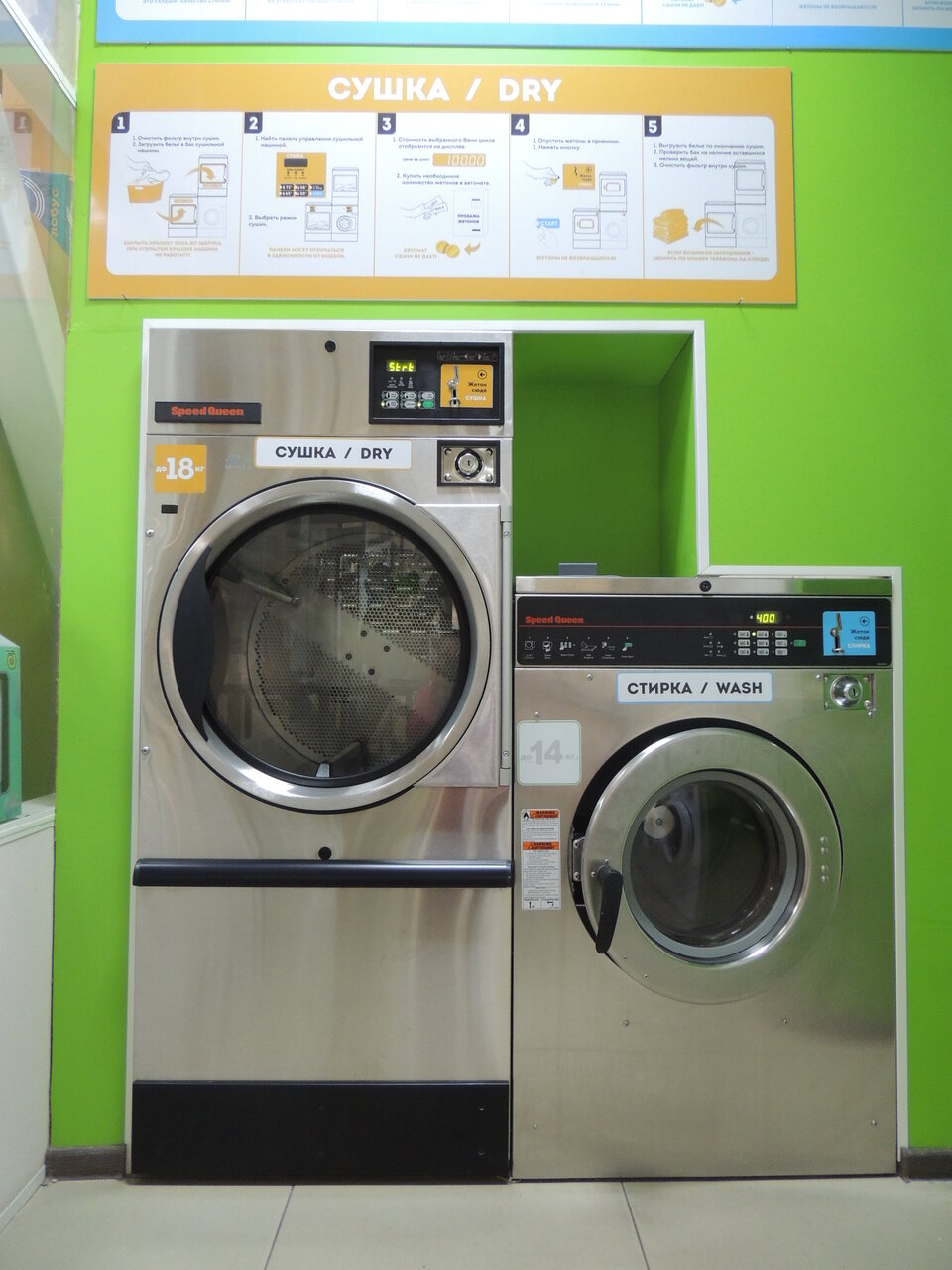 Стирает чисто, сушит хорошо,сушку можно остановить в любой момент, моющие средства нужно приносить с собой. Стирка-300 руб(3 жетона по 100 руб). Сушка-100 руб (1жетон). Рубли на жетоны меняет отдельно аппарат, но сдачи не даёт))).