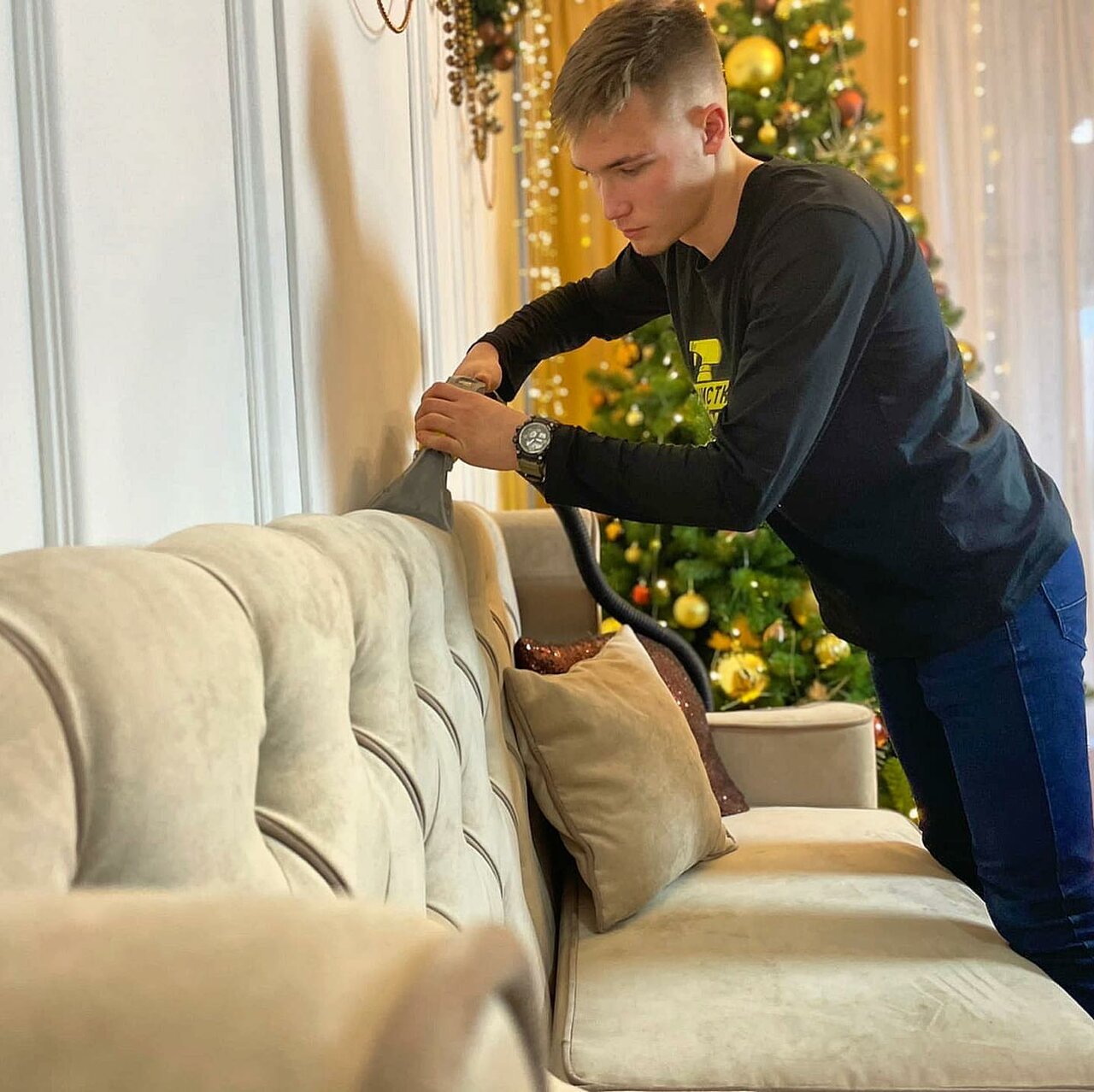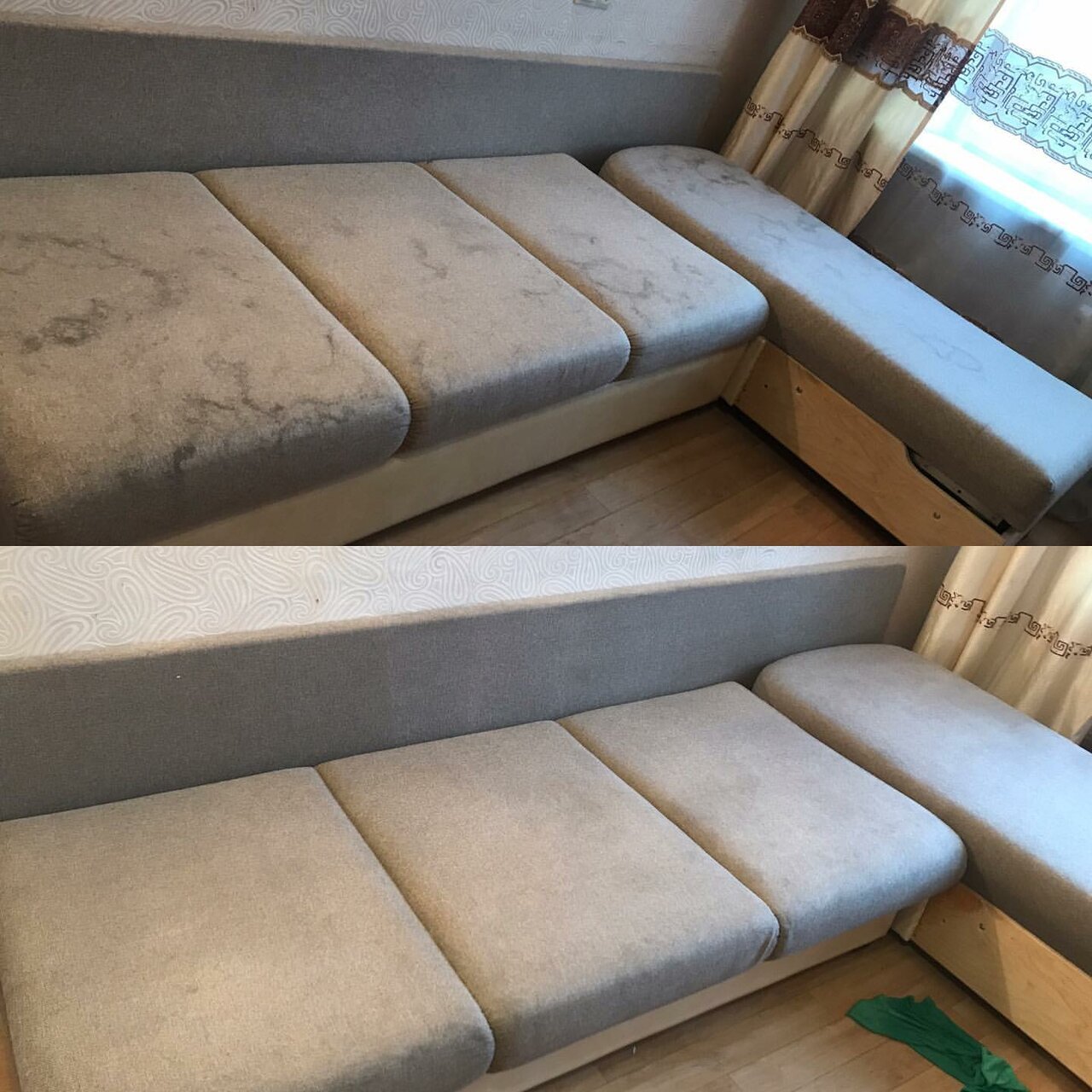 Почистили диван угловой раскладной и кресло раскладное нормально, заплатили за работу 2700 руб (фото прилагаются). Не сказали что нужно закрывать обои (обои остались забрызганные грязными каплями). Когда помыли подушки от дивана и решили их вынести на балкон, сломали рулонную штору и мне ничего не сказали.