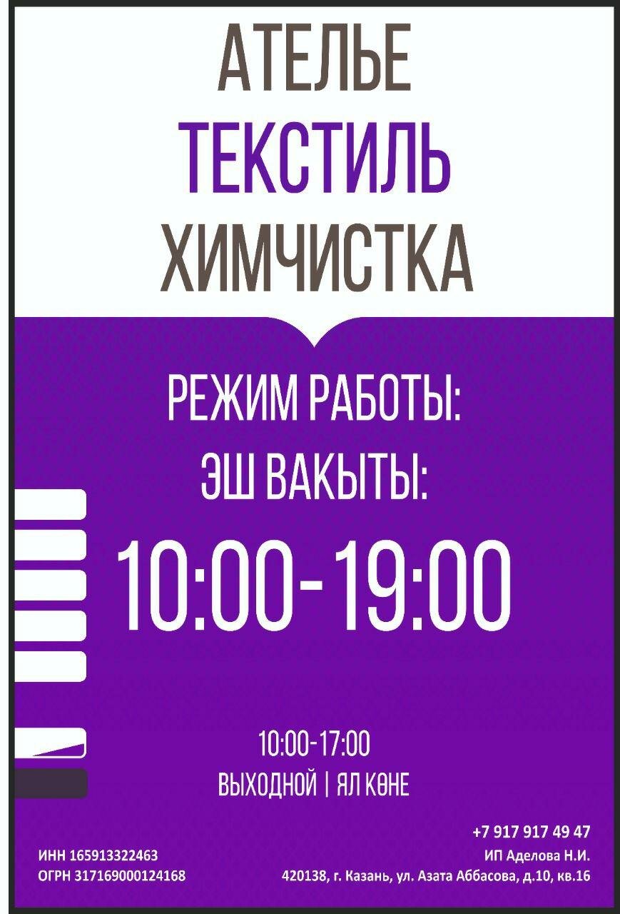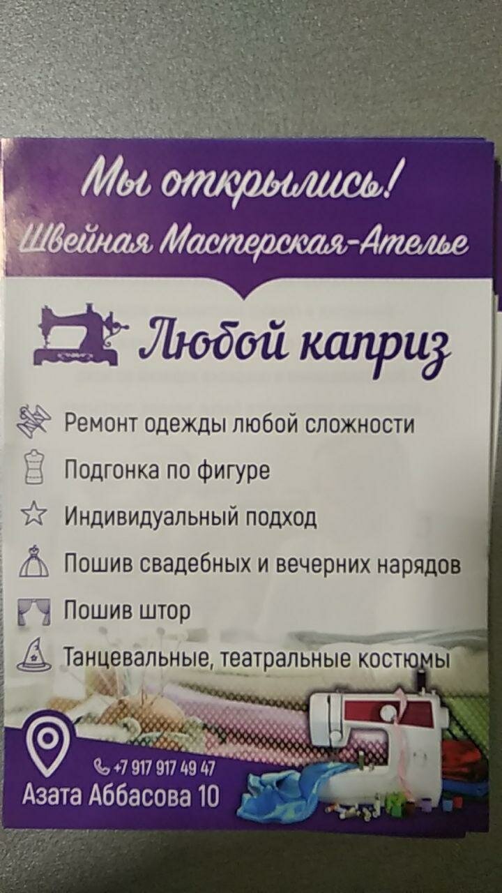 Химчистка «Любой Каприз» в Казани, расположенная по адресу ул. Азата Аббасова, 10, предлагает профессиональную очистку одежды, обуви, текстиля, кожи, меха, ковров и мебели. Работает пн-пт с 10:00 до 19:00 (перерыв 13:00–14:00), сб с 11:00 до 17:00 (перерыв 13:00–14:00). Дополнительные услуги: прачечная, доставка, обслуживание на дому. Контактный телефон: +7 (917) 917-49-47.