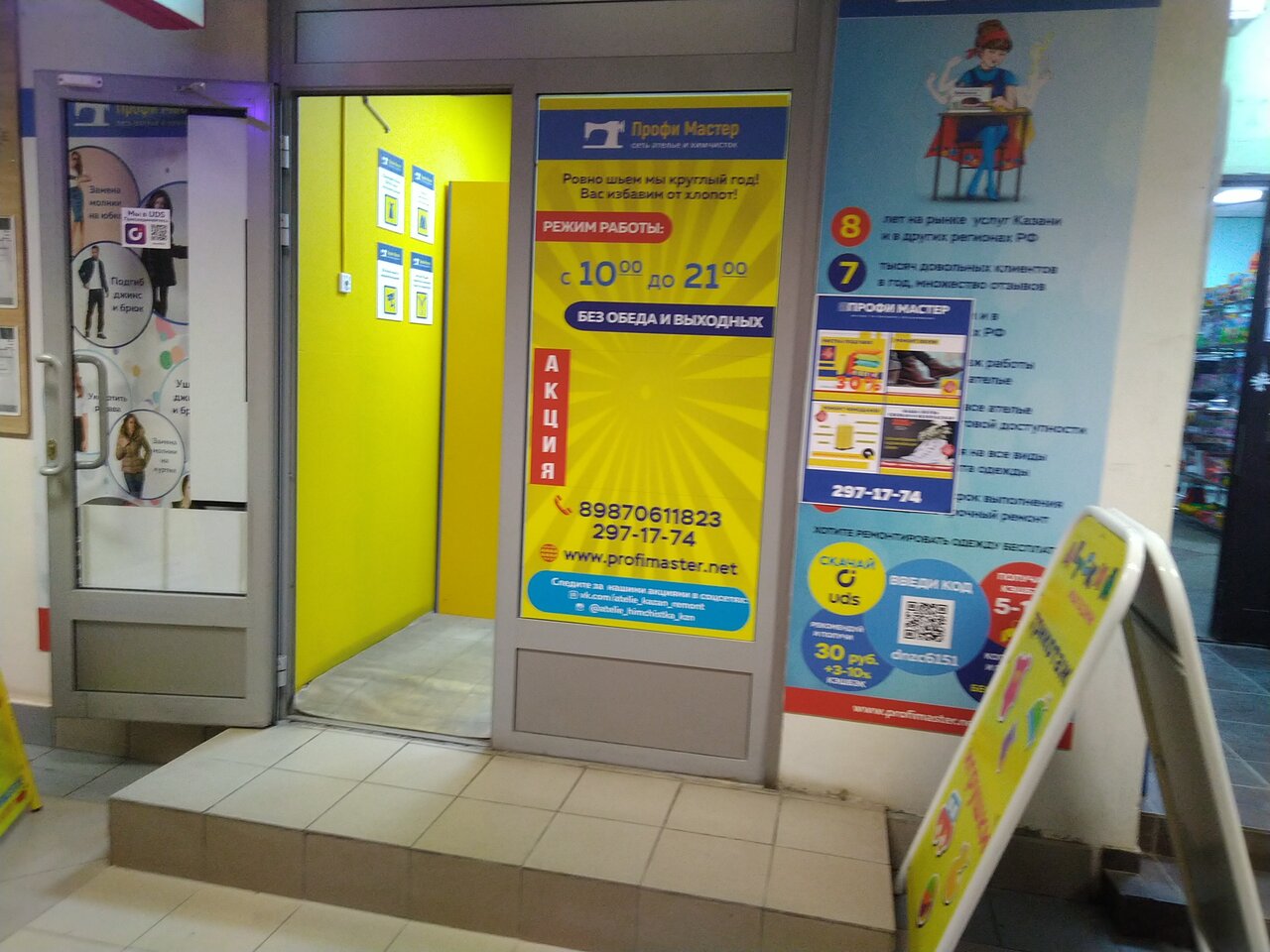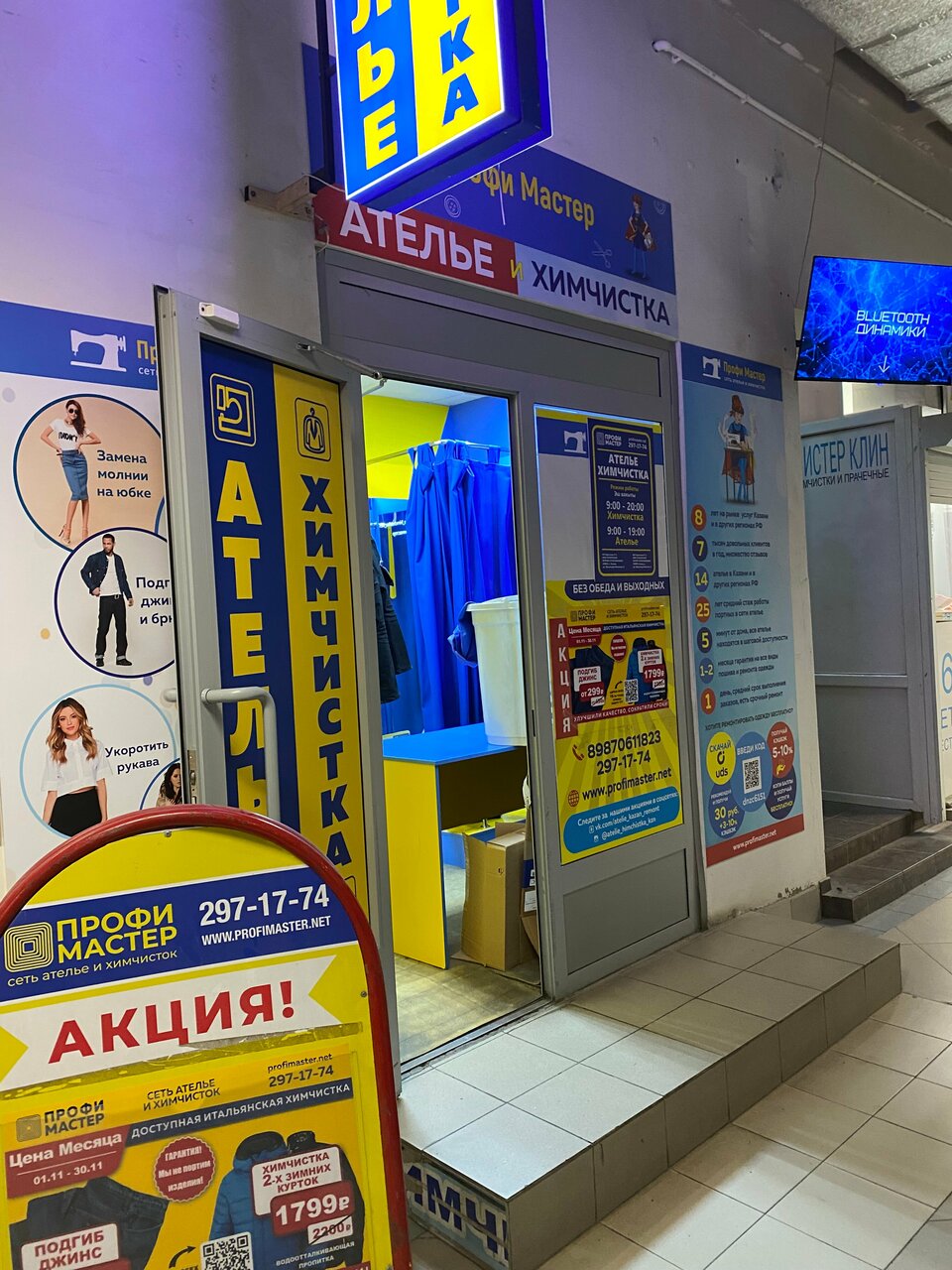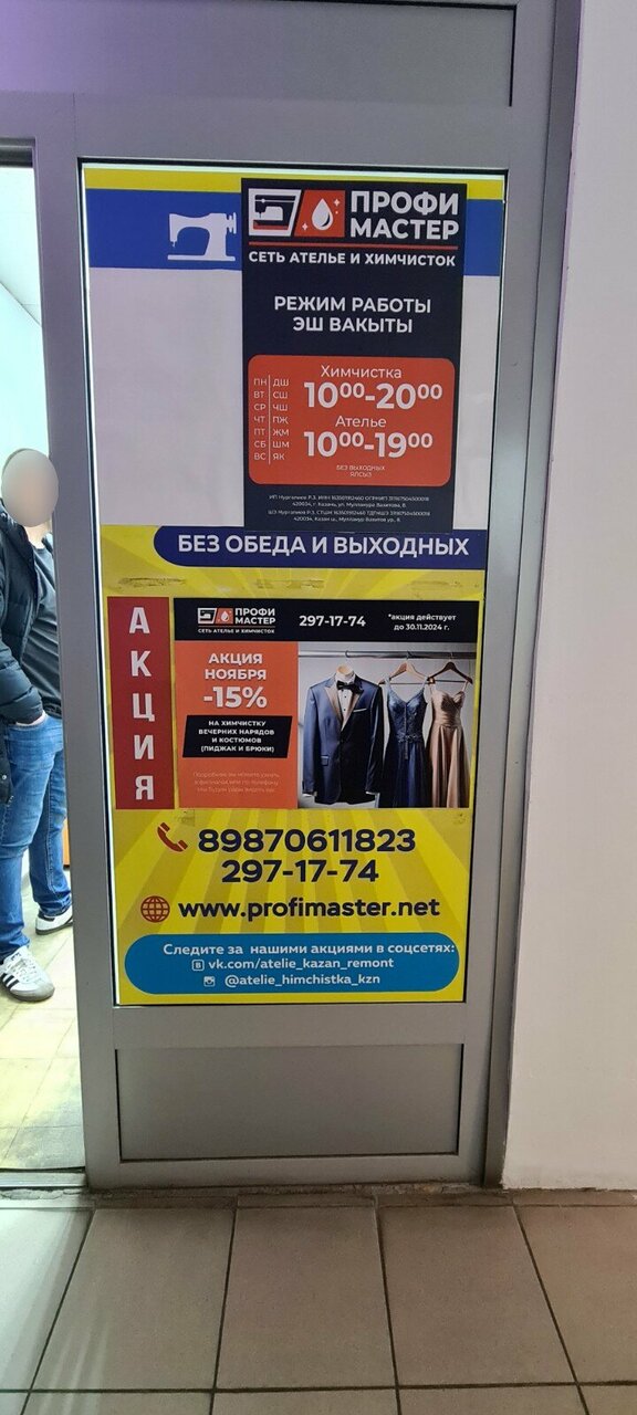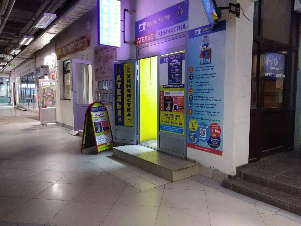 Профи Мастер — профессиональная химчистка в Казани, расположенная по адресу проспект Ямашева, 93. Салон предлагает качественную очистку одежды, обуви, текстиля, кожи, меха, ковров и мебели с использованием современных технологий и специализированных средств. Работает ежедневно с 10:00 до 20:00. Контакты: +7 (843) 297-17-74 (контакт-центр), +7 (987) 061-18-23 (салон). Подробнее на сайте: http://profimaster.net/.