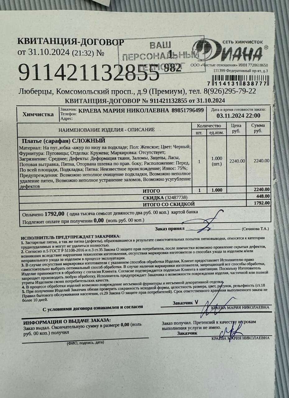 Отличная химчистка. Взялись за трудную работу – результатом доволен. Спасибо персоналу за консультацию😌 Еще бы вывеску у самого входа сделали и вообще супер Квитанция: 911421167786