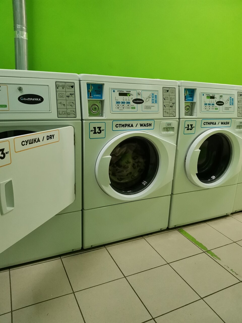 Супер! Стираю здесь габаритные покрывала и одеяла! Очень удобно! 2 машины. Порошок свой. Сушка + 100 р. ,но я сушила, так как выжмает отлично! Уйти можно. Никто ничего не украдёт. Я очень рада что рядом с домом есть такая прачка.