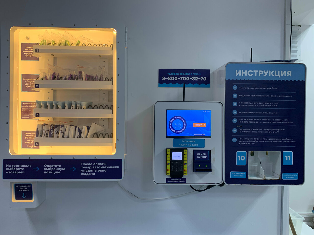 1 порция геля для стирки SYNERGETIC. За 1,5 часа до закрытия терминал не принимает оплату на стирку и сушку!