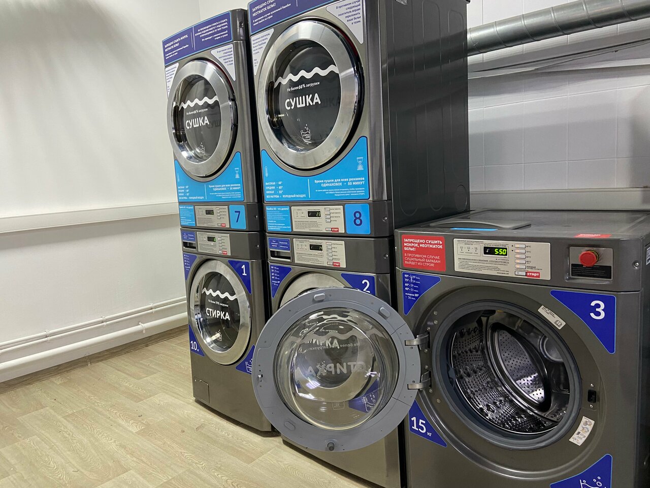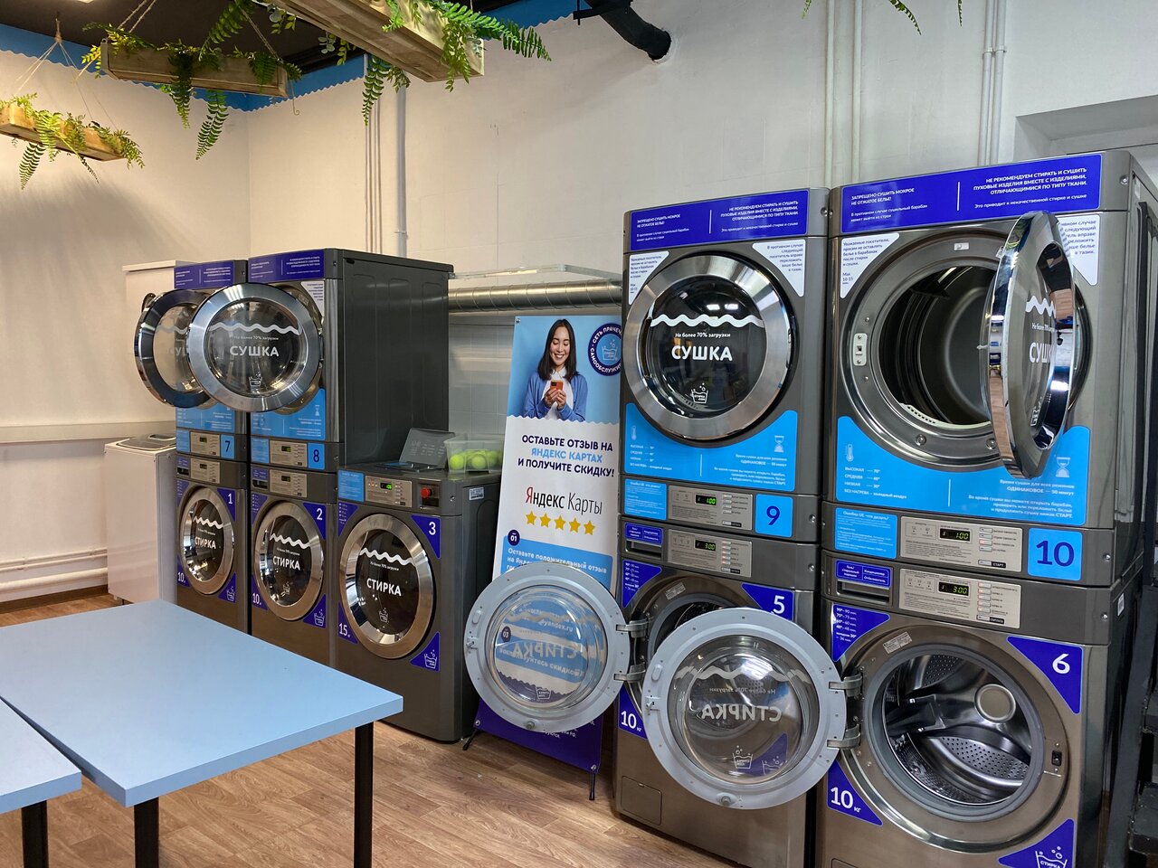 Хорошие стиральные и сушильные машинки, есть большая загрузка на 15кг. Прсторное помещение. Удобный терминал для оплаты.
