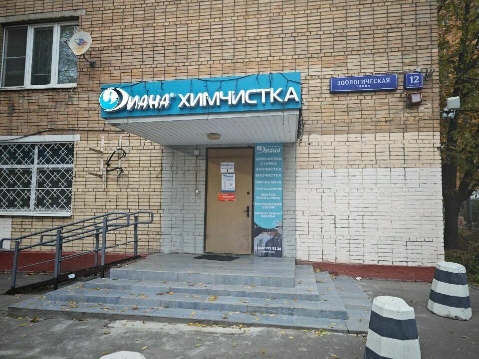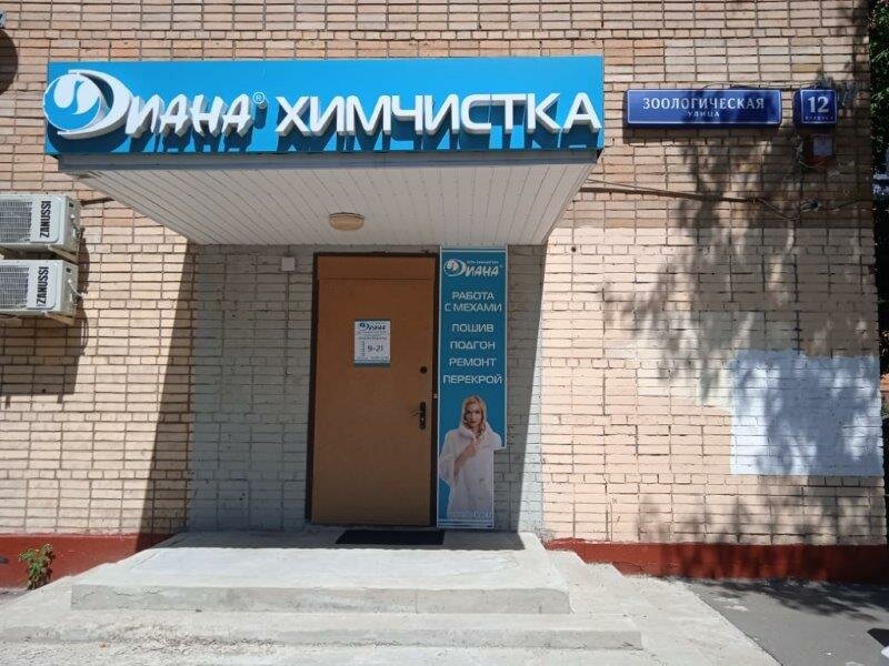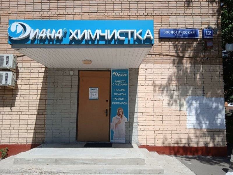 Химчистка «Диана» в Москве, расположенная по адресу Зоологическая улица, 12, корп. 1, предлагает профессиональную чистку одежды, обуви, текстиля, кожи, меха, ковров и мебели. Работает ежедневно с 10:00 до 21:00. Дополнительные услуги: доставка, мойка окон и витрин, прачечная, уборка помещений. Контакты: +7 (916) 240-37-10, 8 (800) 222-82-26. Сайт: http://www.dryclean.ru/.