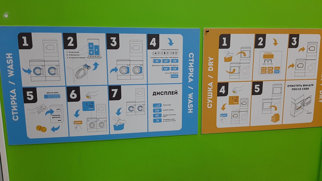 Наконец доехла до этой прачечной. Очень удивлена тем, как здесь чистенько, и что есть все необходимое, можно даже руки помыть! Почитала инструкции, купила жетончики (оплатила apple pay) и вперед: постирала и высушила одняло за 400 рублей. Порошок можно взать свой из дома, а можно купить на месте. Авторам проекта — респект! Всё на уровне⭐️⭐️⭐️⭐️⭐️