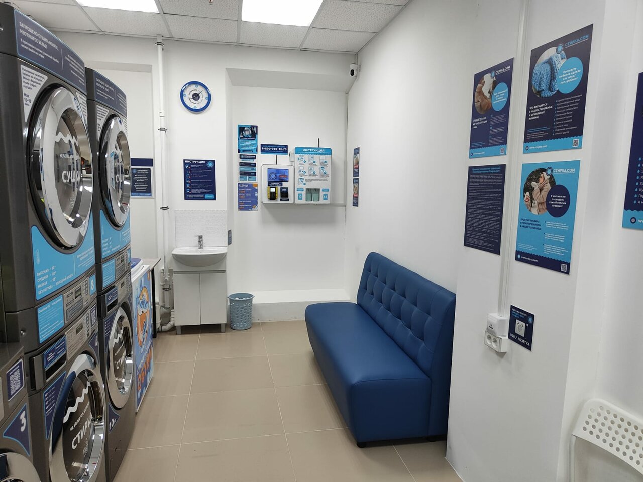 Удобная и современная прачечная, новые вместительные машинки, качественная стирка, красивый дизайн интерьера, есть диванчик для ожидающих. Все инструкции по стирке есть на стендах. Цены нормальные.