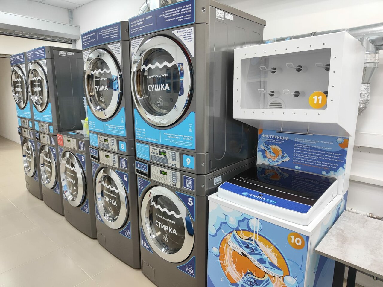 Сушка до 3-х пар обуви одновременно. За 1,5 часа до закрытия терминал не принимает оплату на стирку и сушку!