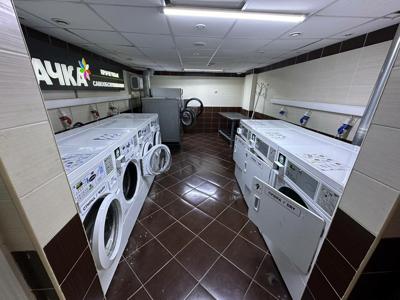 Грязно. Прачечная переоборудована из туалета. Видны оставшиеся следы установки кабинок, остались сливные трубы от унитазов. Аппараты деньги забирают, а потом зависают. Картой расплатиться невозможно! Ни талона ли денег… Некоторые машинки подключены к подаче горячей воды, но вот беда — горячей воды может не быть и ваши вещи постираются в холодной и вы про это не узнаете! Не советую!