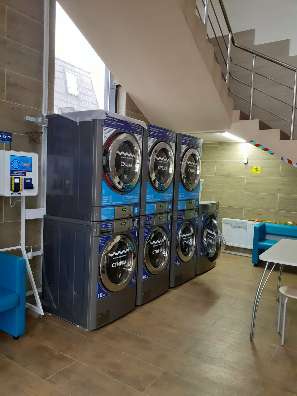 Стирка в машинке загрузкой до 10 кг. За 1,5 часа до закрытия терминал не принимает оплату на стирку и сушку)