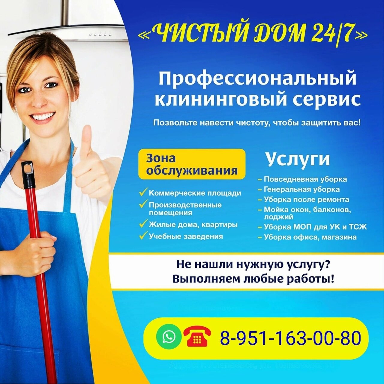 Химчистка «Чистый дом» в Новокузнецке, расположенная по адресу ул. Климасенко, 19, предлагает профессиональную очистку одежды, обуви, текстиля, кожи, меха, ковров и мебели. Салон работает ежедневно и круглосуточно. Дополнительные услуги включают доставку, мойку окон и витрин, а также уборку помещений. Контакты: +7 (980) 115-80-73, сайт: https://tataklin.ru/.