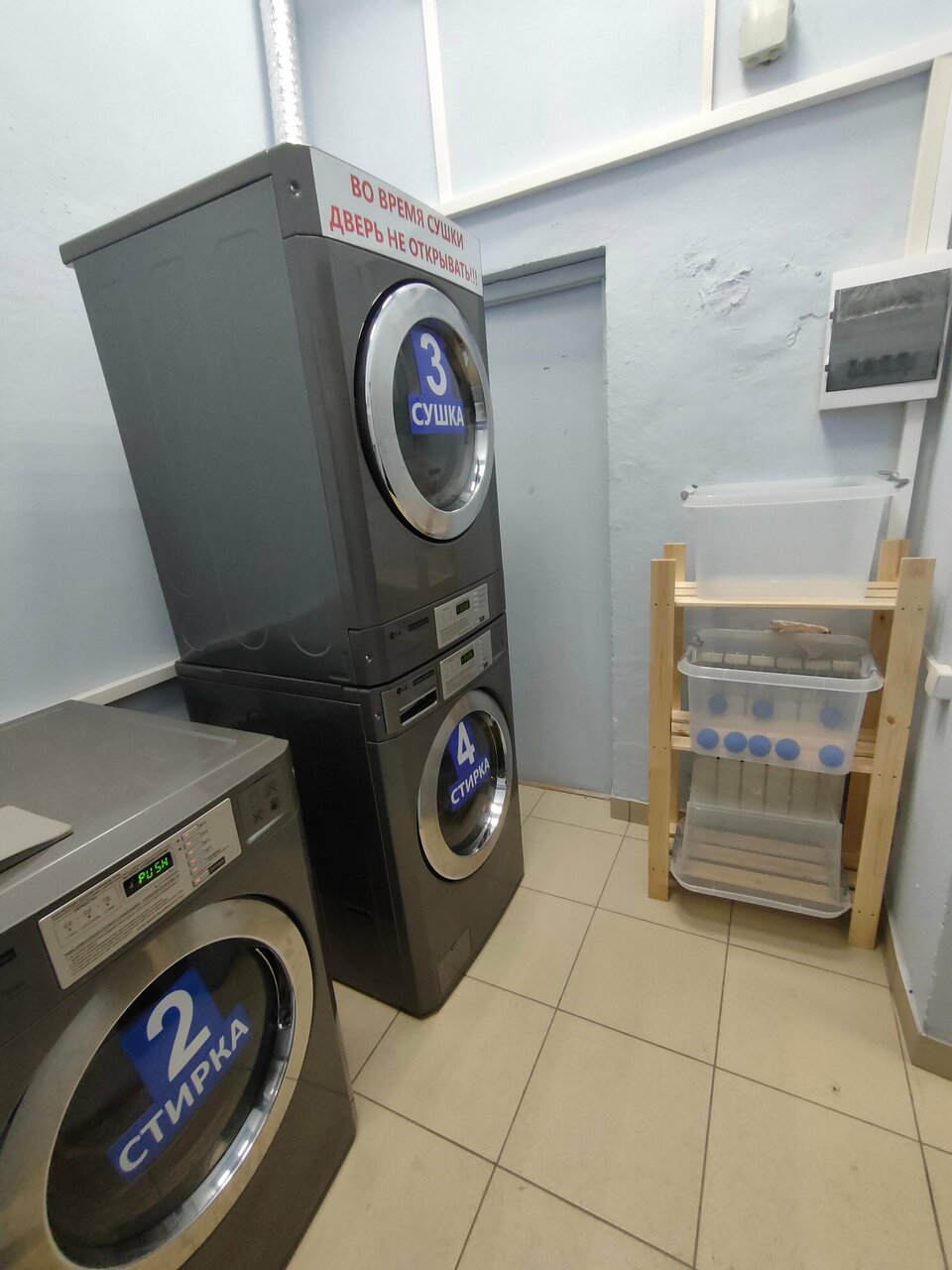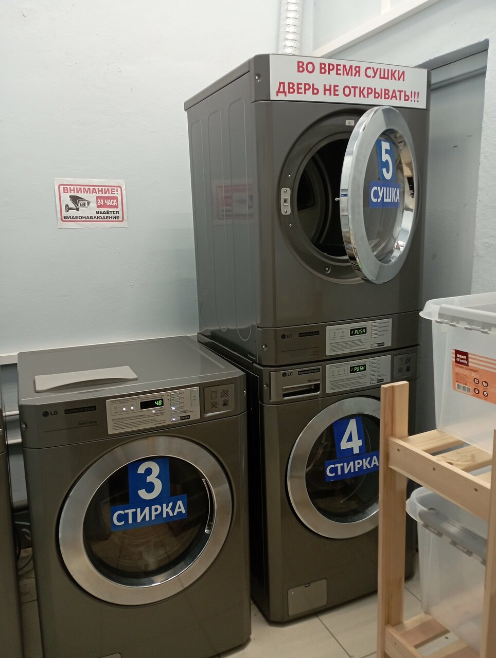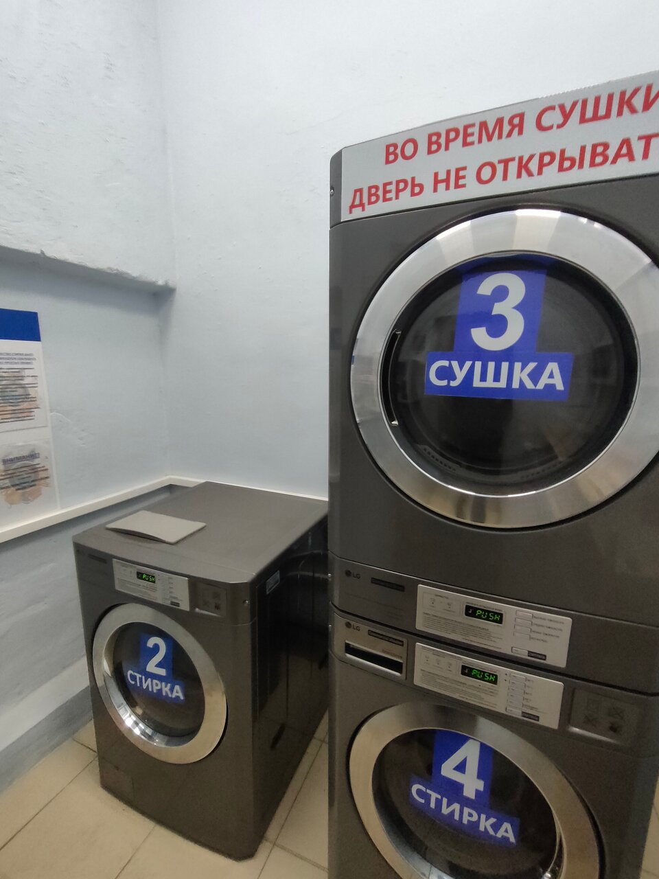 3 машинки, одна сушилка, есть 3 места чтобы подождать окончания работы приборов. Цены на стирку отличаются от указанных, зависит от температуры и времени.
