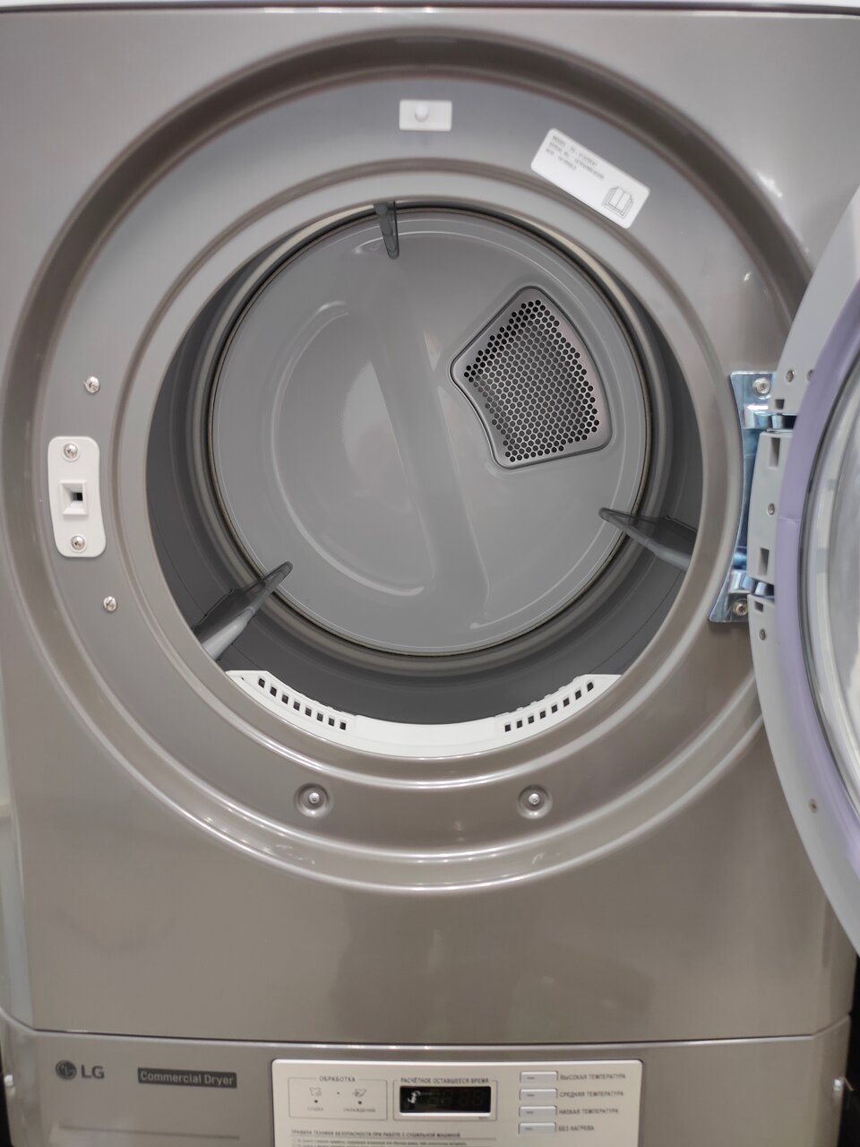 Стирка и сушка в профессиональной машине с большим барабаном.