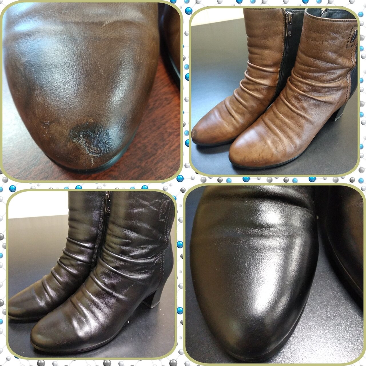 Сдавала пальто из овчины, с кожаными рукавами, после покраски рукавов, вещь , как новая, подобрали цвет, все очень аккуратно. Зимние ботинки,тоже взбодлили, подняли ворс, покрасили в чёрный, в общем, рекомендую, очень довольна.