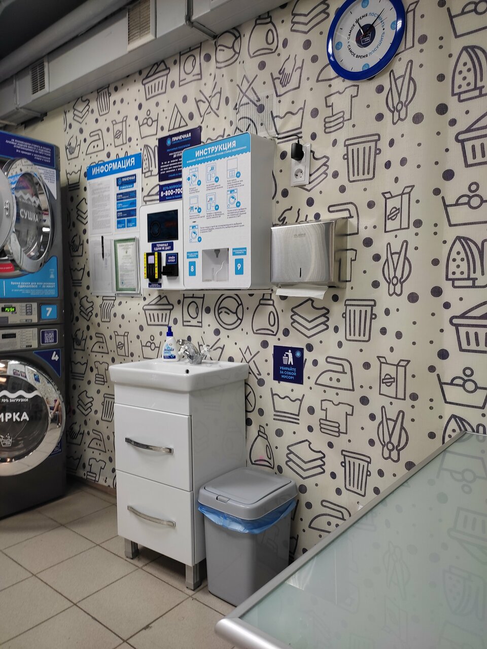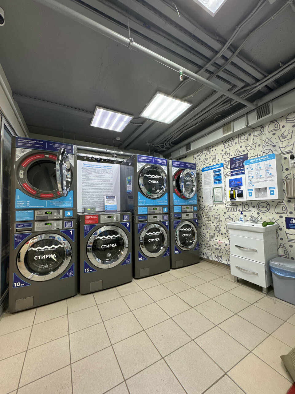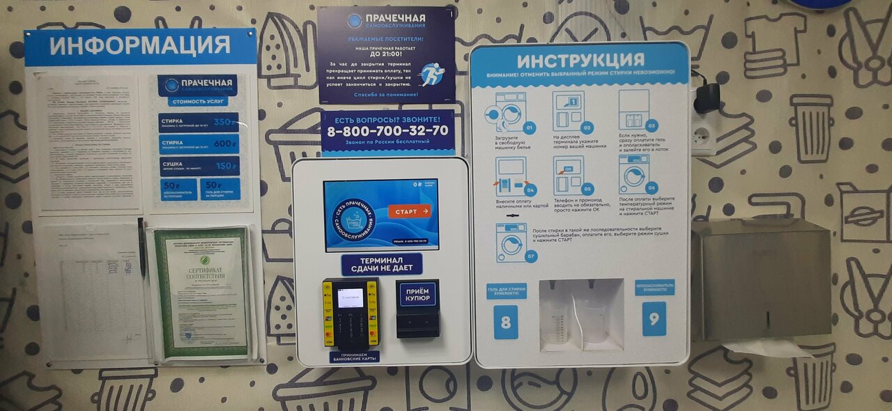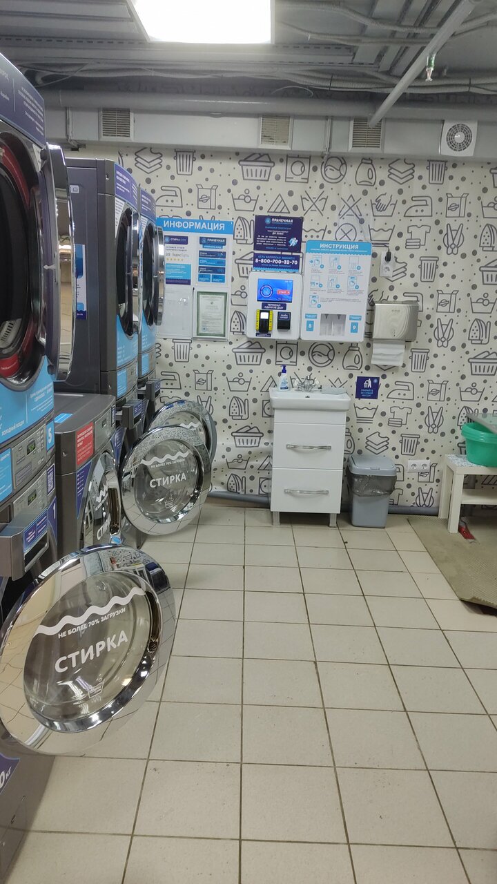 Узнала о существовании данной прачечной по поиску в интернете — сломалась дома стиральная машинка, стирка ‘вручную’ отнимает много времени, создает массу неудобств, плюс при наличии двух детей вещей для, стирки за неделю скапливается все таки много. Могу сказать только — очень очень нужная помощь для людей которым необходима стирка при отсутствии стиральной машинки. Первое впечатление: удобное месторасположение, от моего дома недалеко, в помещении прачечной чисто, аккуратно. Если внимательно все рассмотреть — присутствует справочная информация, на стендах, в т. ч. есть инструкция по запуску стиральной машинки. При необходимости можно сделать звонок на телефон ‘горячей линии’ все объяснят. Во время, стирки можно зайти в некоторые магазинчики, которые находятся, рядом. Со своей задачей по стирке и сушке вещей (есть также сушильные машинки) стиральные машинки справляются, отлично. Также несомненный плюс — довольно адекватные цены за стирку.