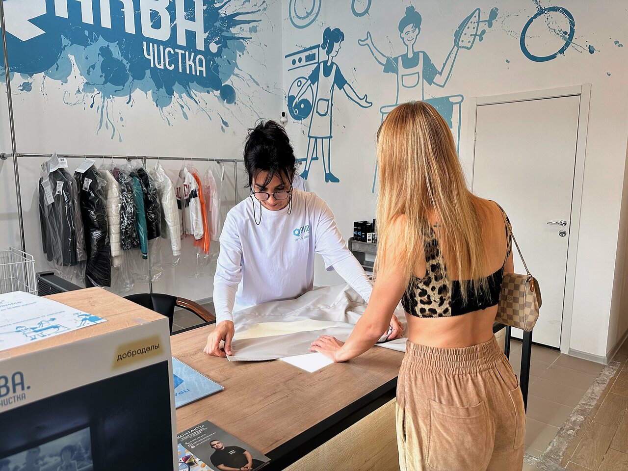 Прекрасная и стильная химчистка!!! Качественно все делают, так же есть стеллажи с хим.-быт. товарами, которые можно приобрести, что очень удобно!