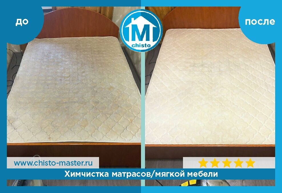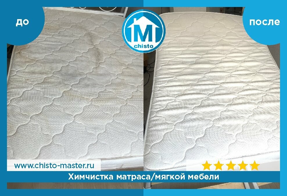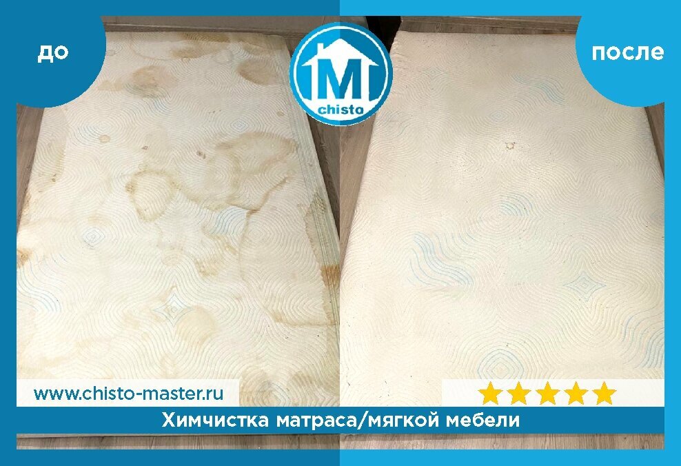 Вызвали мастера почистить двуспальный матрас. Было 3 больших желтых пятна, очень старых времен. На мое удивление всё очитилось и матрас теперь как новый. Билейший. Спасибо Константину, всё четко и по цене приятно.