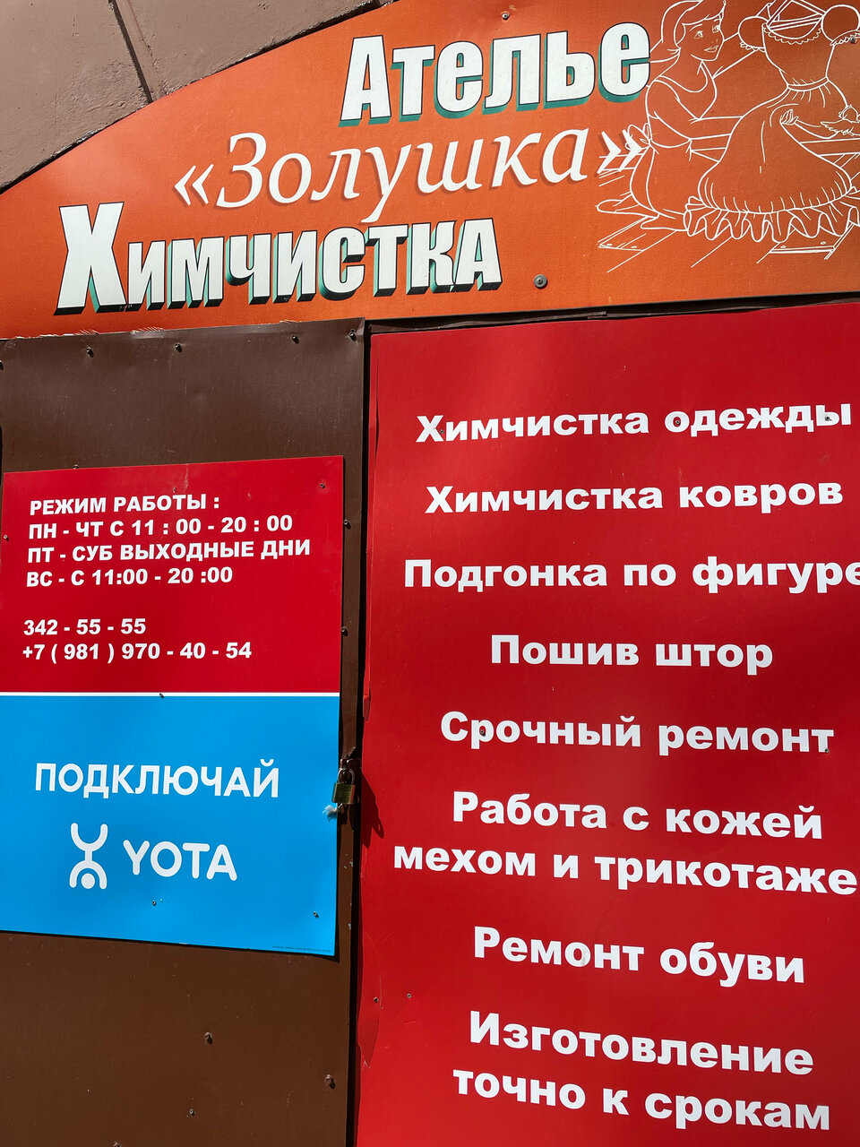 Химчистка «Золушка» в Санкт-Петербурге предлагает профессиональную очистку одежды, обуви, текстиля, кожи, меха, ковров и мебели с использованием современных технологий и специализированных средств. Салон расположен по адресу: Камышовая улица, 46, корп. 3. Режим работы: пн, вт, ср, чт, вс с 11:00 до 20:00. Контактные телефоны: +7 (981) 970-40-54, +7 (812) 342-55-55. Дополнительные услуги не указаны.