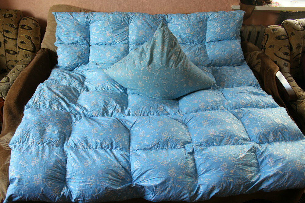 Размер: 1,75*2,15 смСобственное производство , ателье РАДОСТЬ г.Тамбов.Ткань ТИК - пуходержащий Хлопок - 100 %Наполнение: пух - 30% , перо - 70%