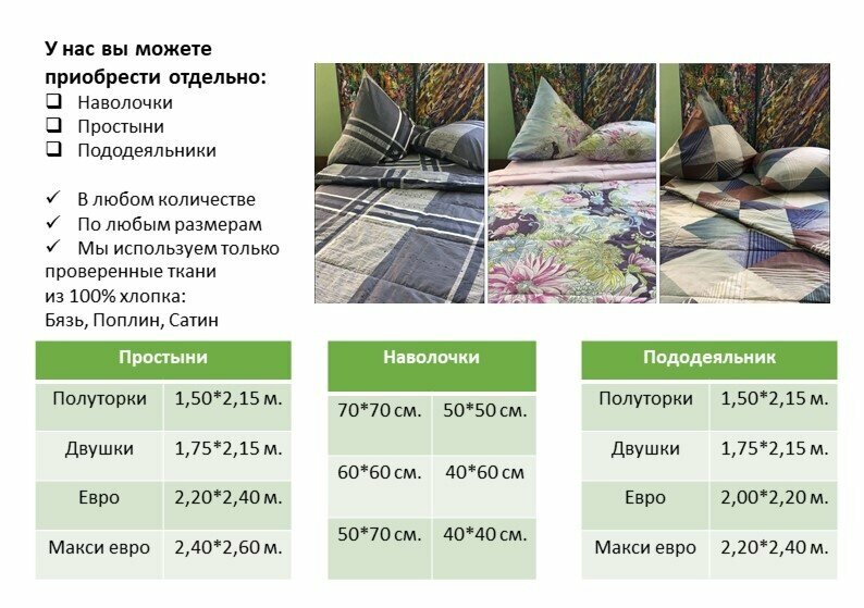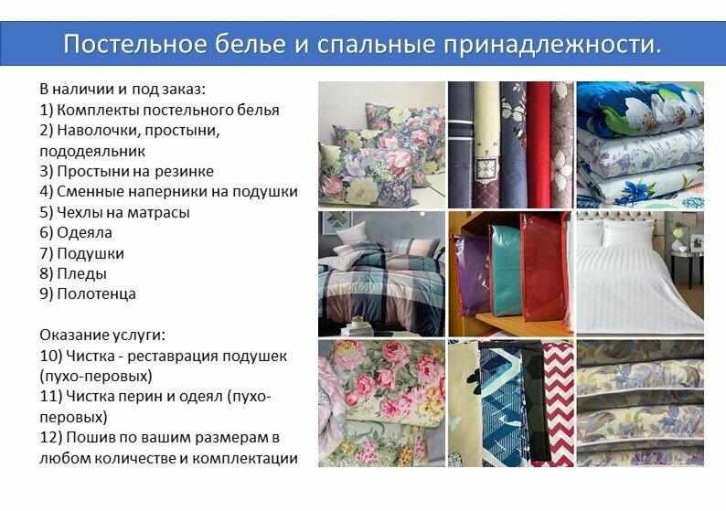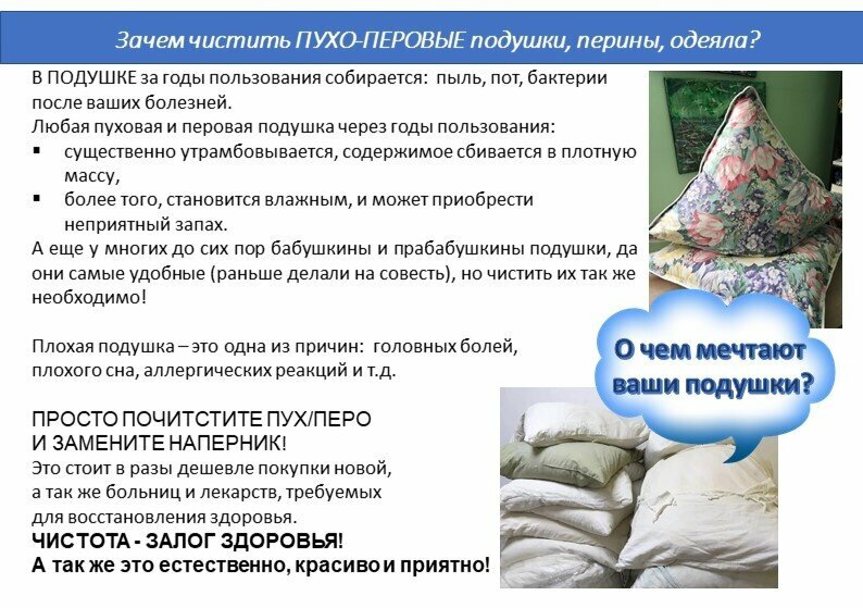 - Быстрое и качественное выполнение услуг (реставрация одеяла, чистка подушек).