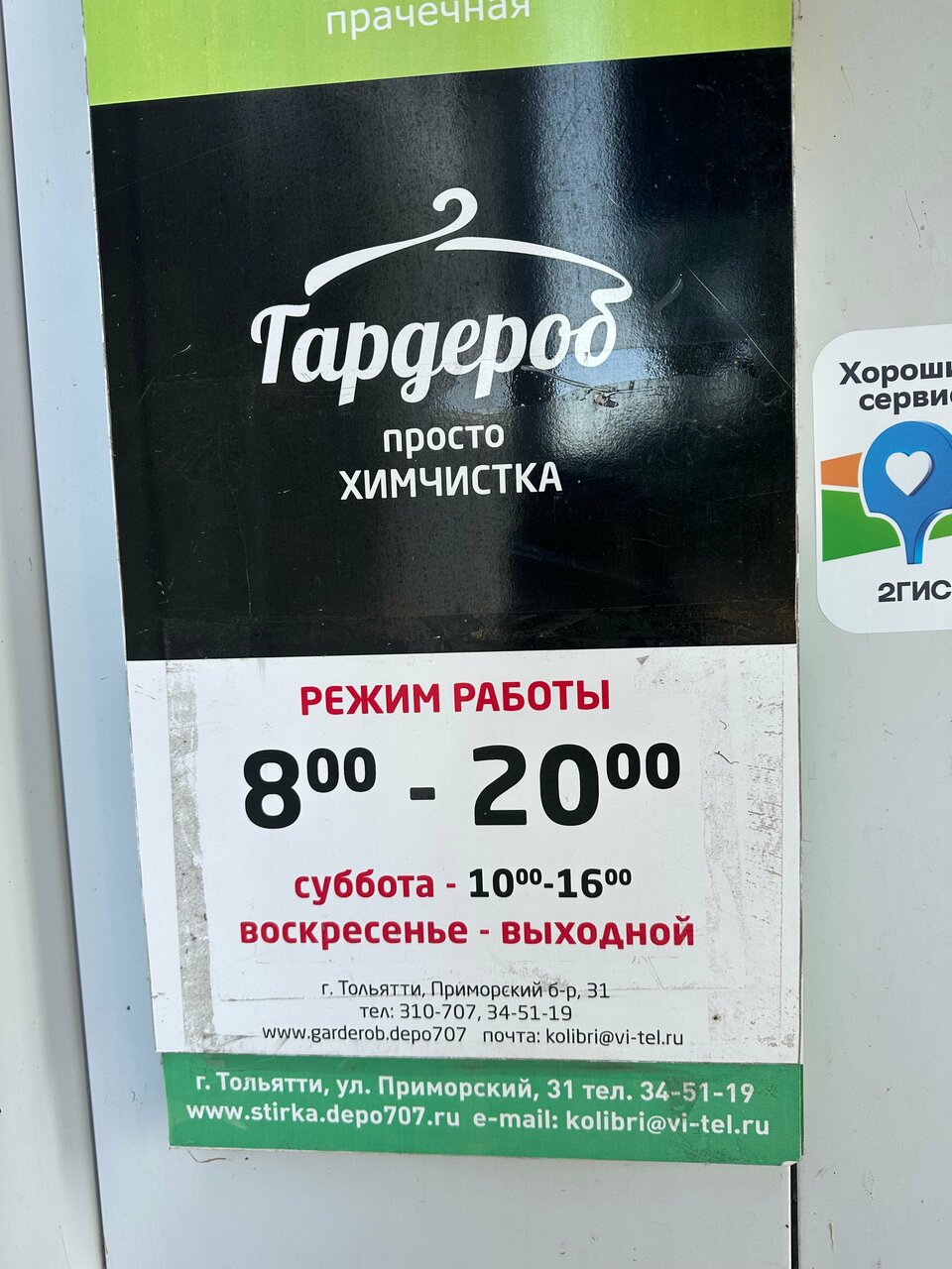 Химчистка «Гардероб» в Тольятти, расположенная по адресу Приморский бульвар, 31, предлагает профессиональную очистку одежды, обуви, текстиля, кожи, меха, ковров и мебели. Работает с понедельника по пятницу с 08:00 до 20:00, в субботу с 10:00 до 16:00. Дополнительные услуги: стирка спецодежды, прачечная, доставка. Контакты: +7 (8482) 31-07-07, +7 (8482) 34-51-19.