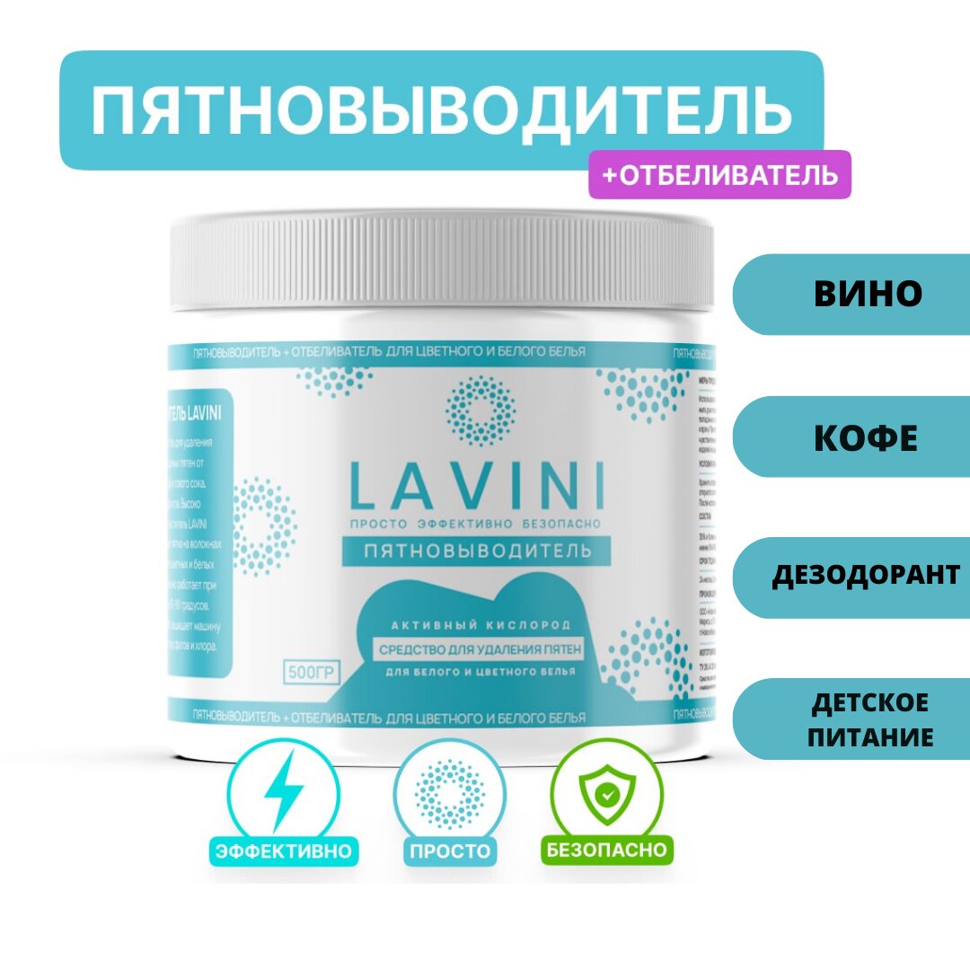 LAVINI ОЧИСТИТЕЛЬ ДЛЯ УДАЛЕНИЯ ПЯТЕНПЯТНОВЫВОДИТЕЛЬ + ОТБЕЛИВАТЕЛЬ ДЛЯ ЦВЕТНОГО И БЕЛОГО БЕЛЬЯМоющеее средство LAVINI – это эффективное средство для удаления сложных трудновыводимых пятен от желтых следов от дезодоранта, кофе, чая, какао, вина